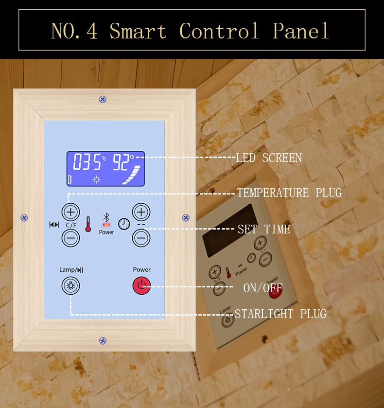 - ໄລຍະເວລາຂອງ Sauna ສະຫນອງການຕັ້ງຄ່າຫຼາຍຢ່າງຈາກ 15 ຫາ 90 ນາທີ, ດ້ວຍການເຕືອນອັດຕະໂນມັດແລະການເຮັດຄວາມເຢັນເທື່ອລະກ້າວຫຼັງຈາກເວລາທີ່ກໍານົດໄວ້ກ່ອນເພື່ອຫຼີກເວັ້ນການບໍ່ສະບາຍຈາກການໃຊ້ຫຼາຍເກີນໄປ.
