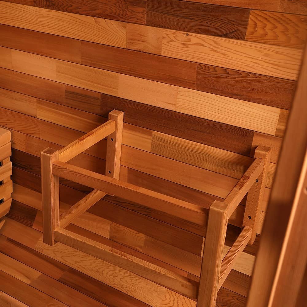 - ວັດສະດຸຕົ້ນຕໍ: ໄມ້ແຂງທົນທານຕໍ່ຄວາມຮ້ອນທີ່ມີຄຸນນະພາບສູງຖືກນໍາໃຊ້ຕະຫຼອດ (ຝາ, ເບນ, ແລະກອບແມ່ນໄມ້ແຂງ), ປະຕິບັດຢ່າງເປັນມືອາຊີບເພື່ອຄວາມຊຸ່ມຊື່ນແລະທົນທານຕໍ່ຄວາມຮ້ອນເພື່ອປັບຕົວເຂົ້າກັບສະພາບແວດລ້ອມຊາວຫນ້າທີ່ມີອຸນຫະພູມສູງແລະຄວາມຊຸ່ມຊື່ນສູງ.